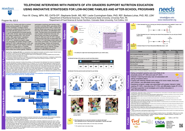 Cheng F, Smith S, Cunningham-Sabo L, Lohse B. Telephone Interviews with Parents of 4th Graders Support Nutrition Education Using Innovative Strategies for Low-Income Families and After-School Programs. Annual Meeting of the American Society for Nutrition, Experimental Biology. San Diego, CA; April 27, 2014. FASEB J. 2014;28:625.5.